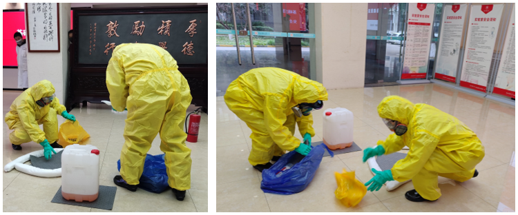 随后开展了废液洒漏紧急处置演练,现场模拟废液桶在传递过程中因不规范操作导致化学品泄露。“险情”发生的第一时间,两位化学专业实验老师迅速作出应急响应,紧急组织疏散实验师生,封锁事故现场,在2分钟内穿戴专业危化防护服,开展应急抢险处置,并对泄漏区域进行环境监测。