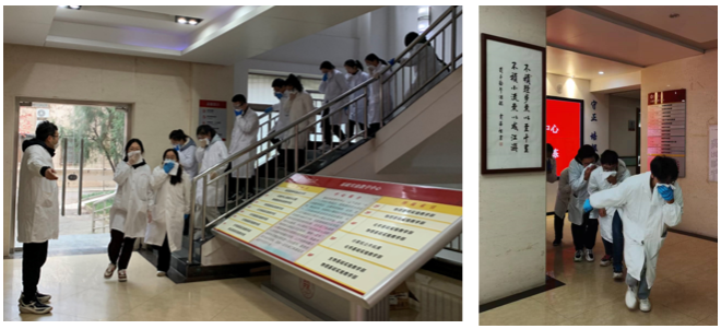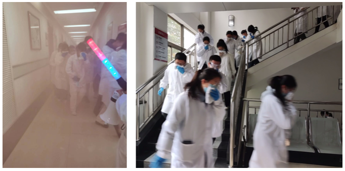 现场模拟教学七楼5层西侧化学色情av 发生“火情”,现场浓烟滚滚,火势迅速向各楼层蔓延,并有人员受伤,情况危急。疏散引导组使用“闪光棒”指挥楼内师生用湿毛巾捂住口鼻,低头弯腰呈一路纵队有序逃离;疏散检查组逐层排查室内人员,清点人员数量,确保无滞留人员;报警组模拟拨打火警电话,汇报火情并进行事故上报,寻求救援;应急救助组迅速将“伤员”救援至开阔地带,在“黄金四分钟”内为伤者实施有效心肺复苏,为AED(自动体外除颤器)和120救护车的到来争取时间,提高抢救效率。