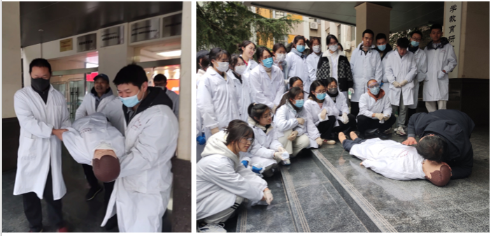 火灾应急疏散完毕之后,工作人员详细讲解了心肺复苏操作步骤及注意事项,并指导师生进行实操演练,不少同学踊跃参与。